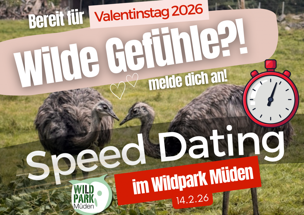 Das Speed Dating findet im Wildpark Müden statt und richtet sich an Singles im Alter von 30 bis 45 Jahren. In entspannter, naturnaher Umgebung lernen sich die Teilnehmenden im Rahmen mehrerer Gesprächsrunden kennen. Die Gespräche finden an verschiedenen Stationen im Park statt und bieten durch den Bezug zur tierischen Umgebung einen natürlichen und ungezwungenen Gesprächseinstieg: Kein langweiliger Smalltalk, sonder ein einmaliges, tierisches und vor allem witziges Erlebnis. „Speed“ bedeutet: jeder Teilnehmer trifft jeweils nur für 6min auf seine 10 Kandidaten.